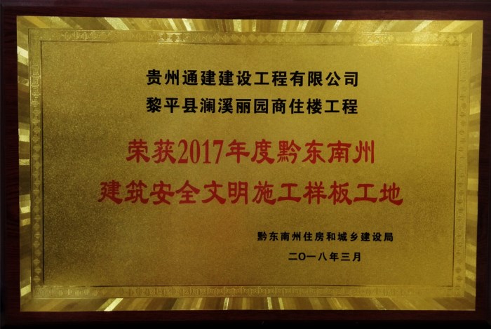 位于黎平县德凤街道西门冲的阑溪丽圆商住楼,是贵州通建建设工程有限公司承建的重点工程项目“阑溪丽圆公租房建筑群”的缩影,也是我公司精心打造的形象样板工程的一个亮点,经公司全体员工的共同努力,“阑溪丽圆商住楼工程”被评为黔东南州“建筑安全文明施工样板工地”,填补了公司在州一级示范工程评比中中奖的空白。